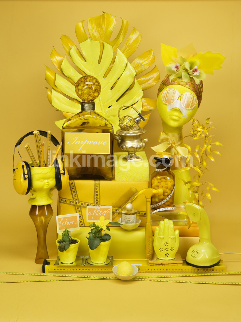 yellow, gold, leaf, hearing protection, telephone, package, tape, ruler, vase, hand, plants, flower, pot, face, mask