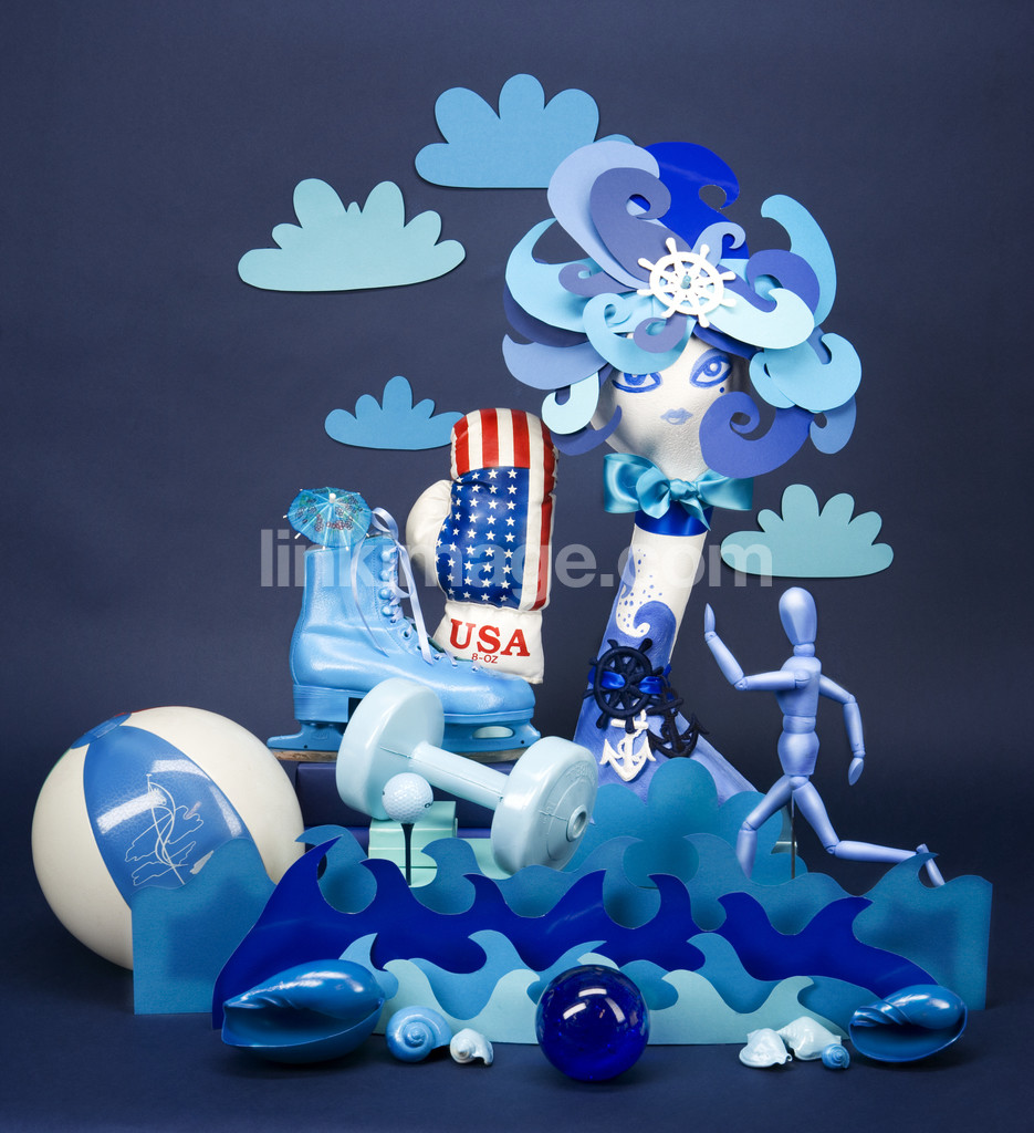 cloud, paper, form, skate, beach ball, sea, holiday, shells, dumbbell, usa, glove, boxing, blue, white
