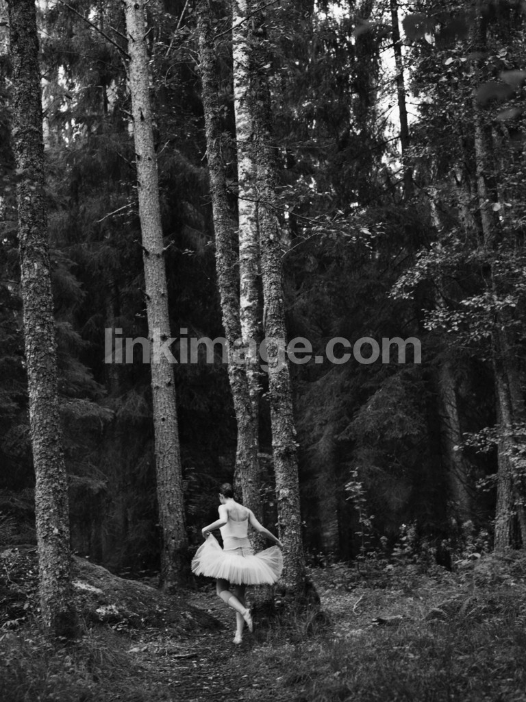 - ballerina, dance, girl, female, black and white, black, white, forest, moss, stone, tree, pine, balance