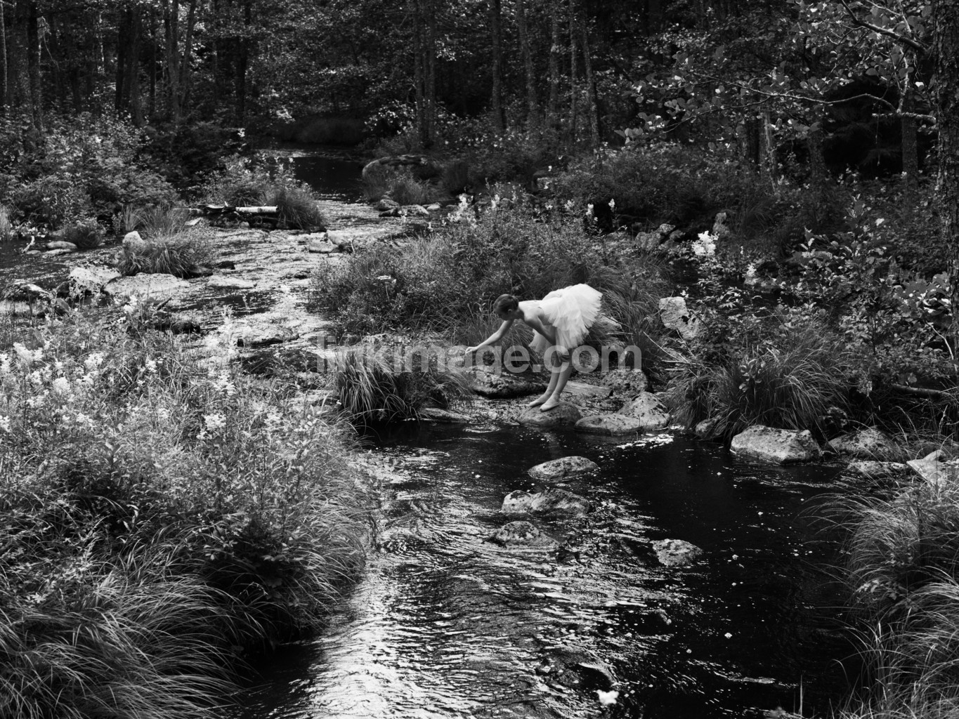 - ballerina, dance, girl, female, black and white, black, white, forest, moss, stone, tree, pine, water, on, balance
