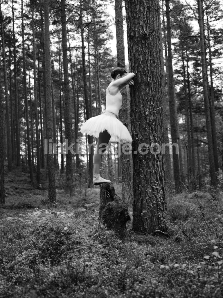 - ballerina, dance, girl, female, black and white, black, white, forest, moss, stone, tree, pine, balance