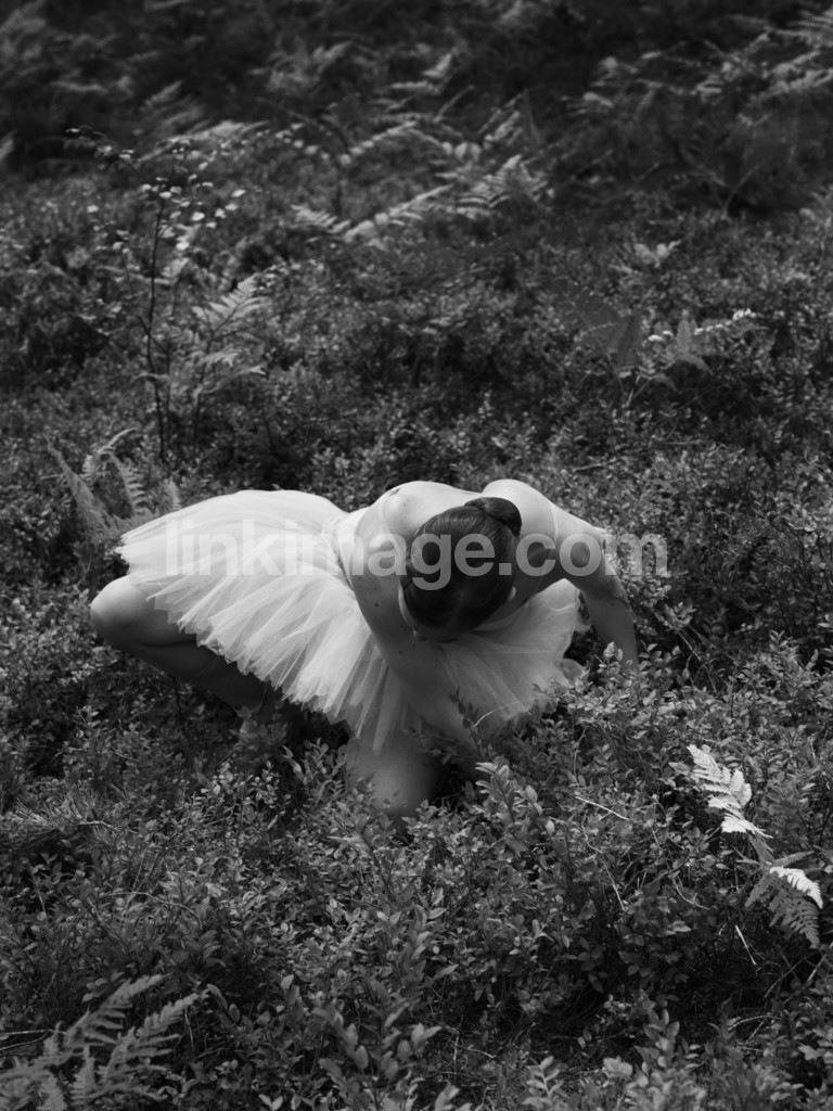 - ballerina, dance, girl, female, black and white, black, white, forest, moss, stone, tree, pine, balance