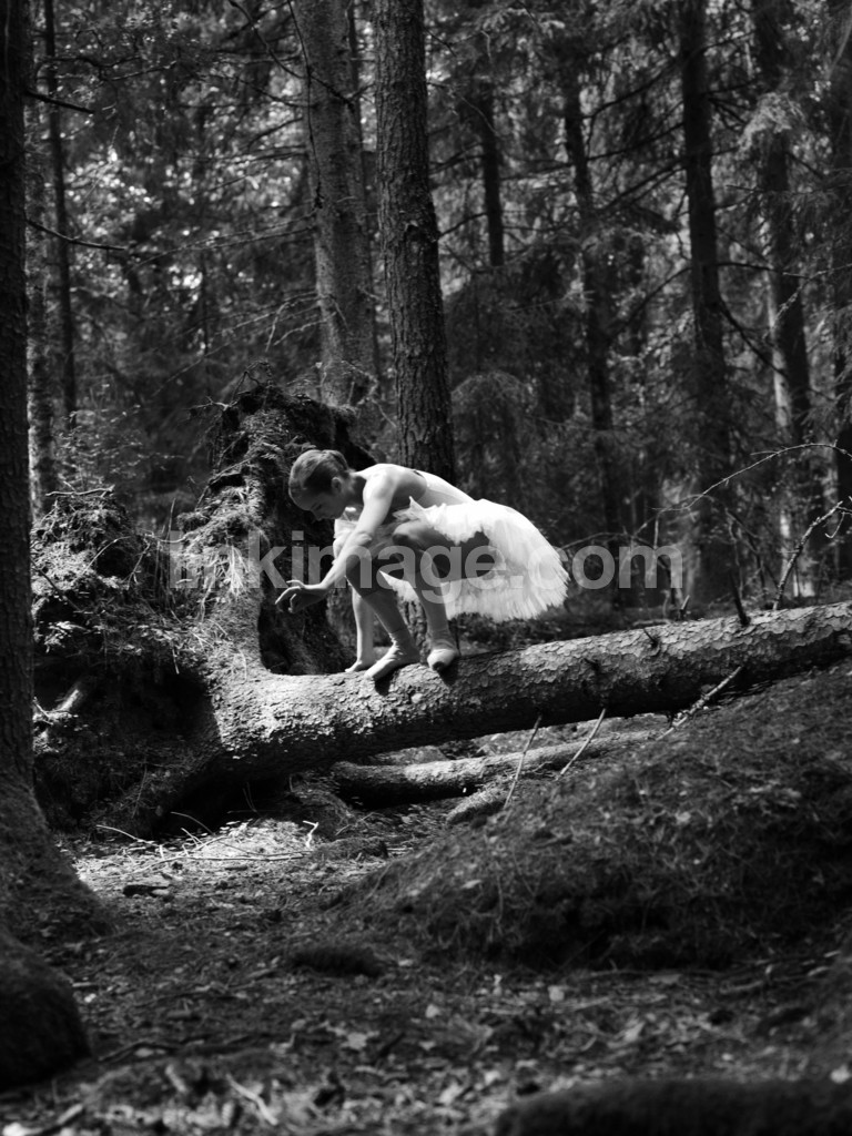 - ballerina, dance, girl, female, black and white, black, white, forest, moss, stone, tree, pine, balance