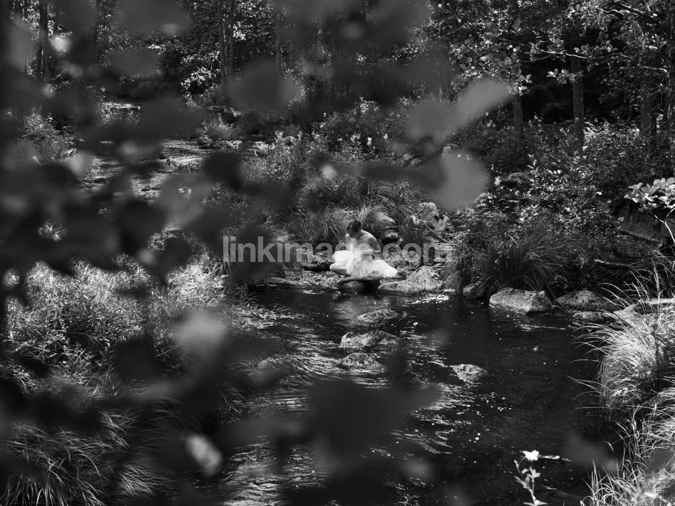 - ballerina, dance, girl, female, black and white, black, white, forest, moss, stone, tree, pine, water, on, balance