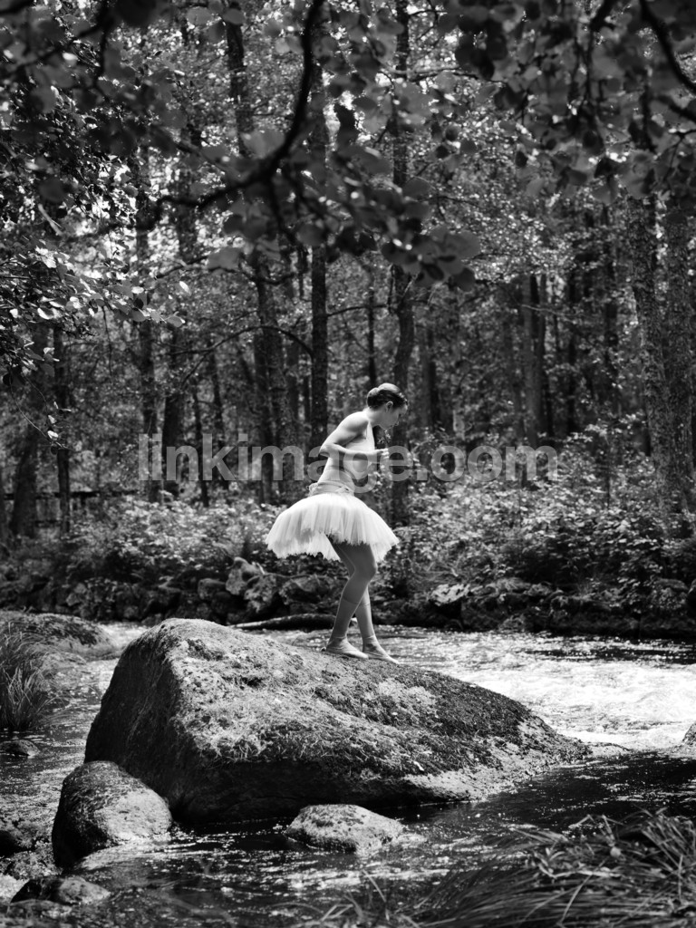 - ballerina, dance, girl, female, black and white, black, white, forest, moss, stone, tree, pine, water, on, balance