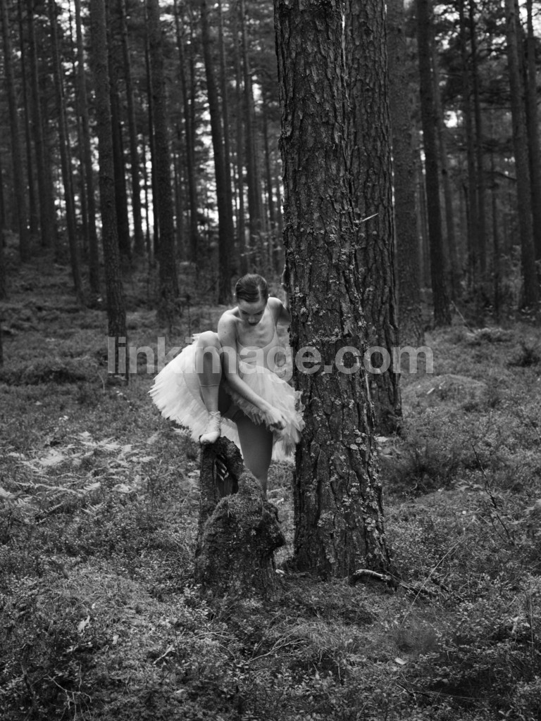 - ballerina, dance, girl, female, black and white, black, white, forest, moss, stone, tree, pine, balance