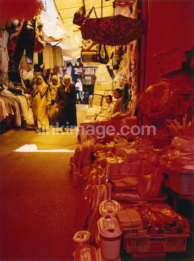 market, red, gadgets, things, women, shawls, sun, light, clothes, umbrella, road, street
