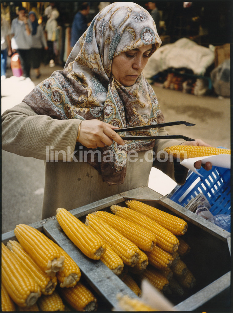 corn, corncob, food, cooking, serve, female, shawl, check, clones, seaweed, crowd, market, tourism, eat, meal