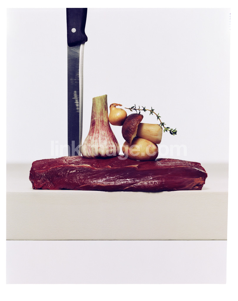 - meat, still life, knife, garlic, mushrooms, potato, spice, group, food, ingredients, cooking
