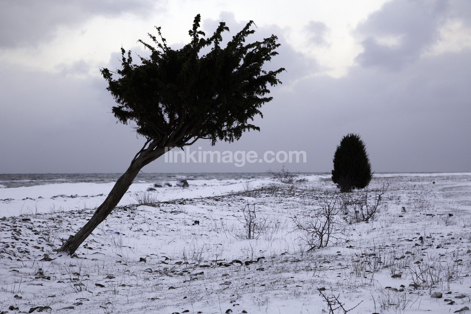 - gotland, fårö, spot, winter, snow, sea, coast, cold, weather, bushes, wind, blown, form, sky, winter landscape, barren, tree