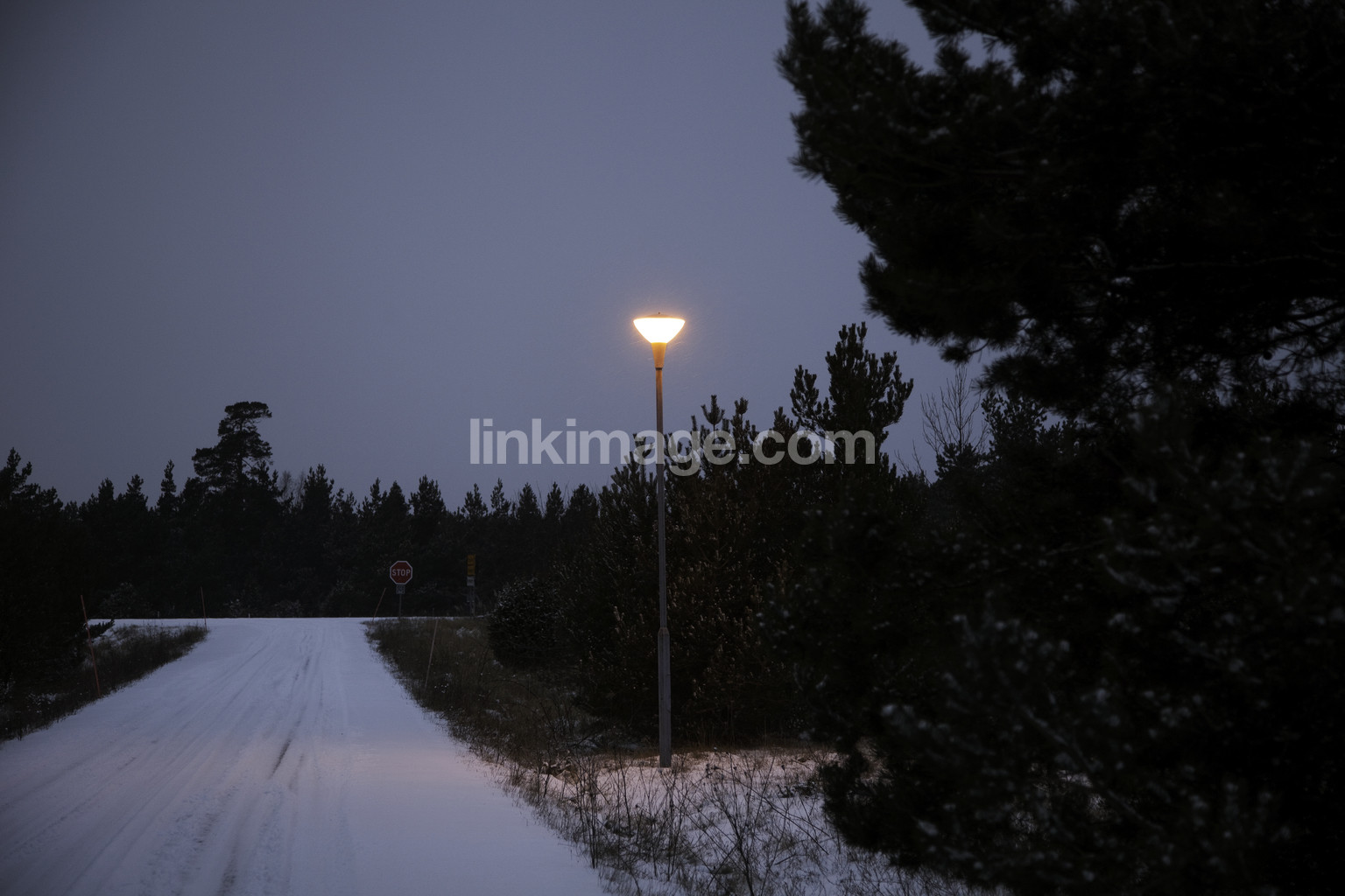 - spot, dusk, light, lamp, street lighting, country, country built, road, snow, winter, lycktstolpe