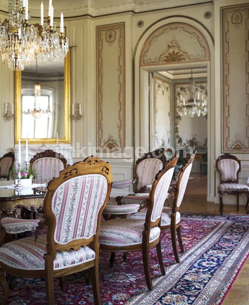- castle environment, mansion, chairs, crystal chandelier, mirror, luxury