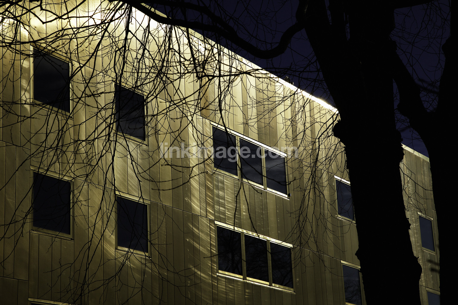 - architecture, housing, lodging, apartment building, window, tree, gold, colors, light, museum, exterior, branches