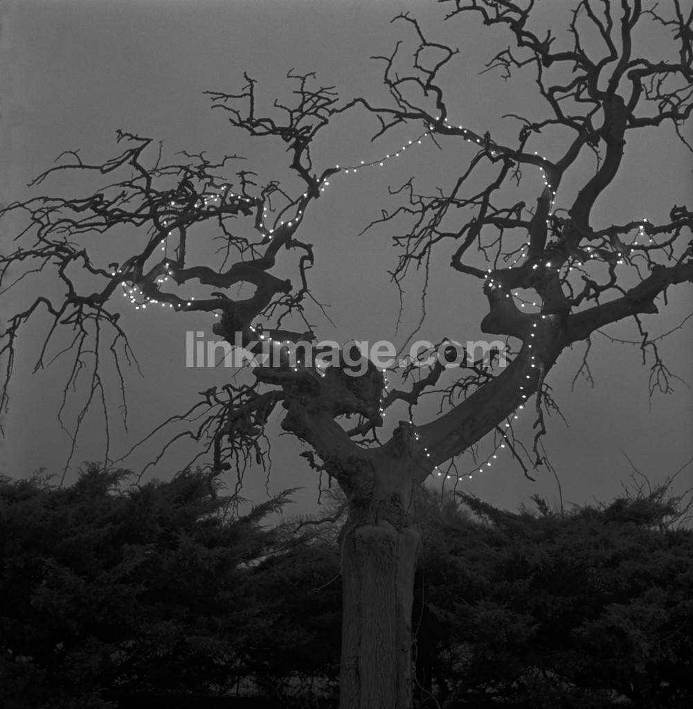 - christmas cards, july, tree, lighting, light strand, lights, branches, sky, dark, evening