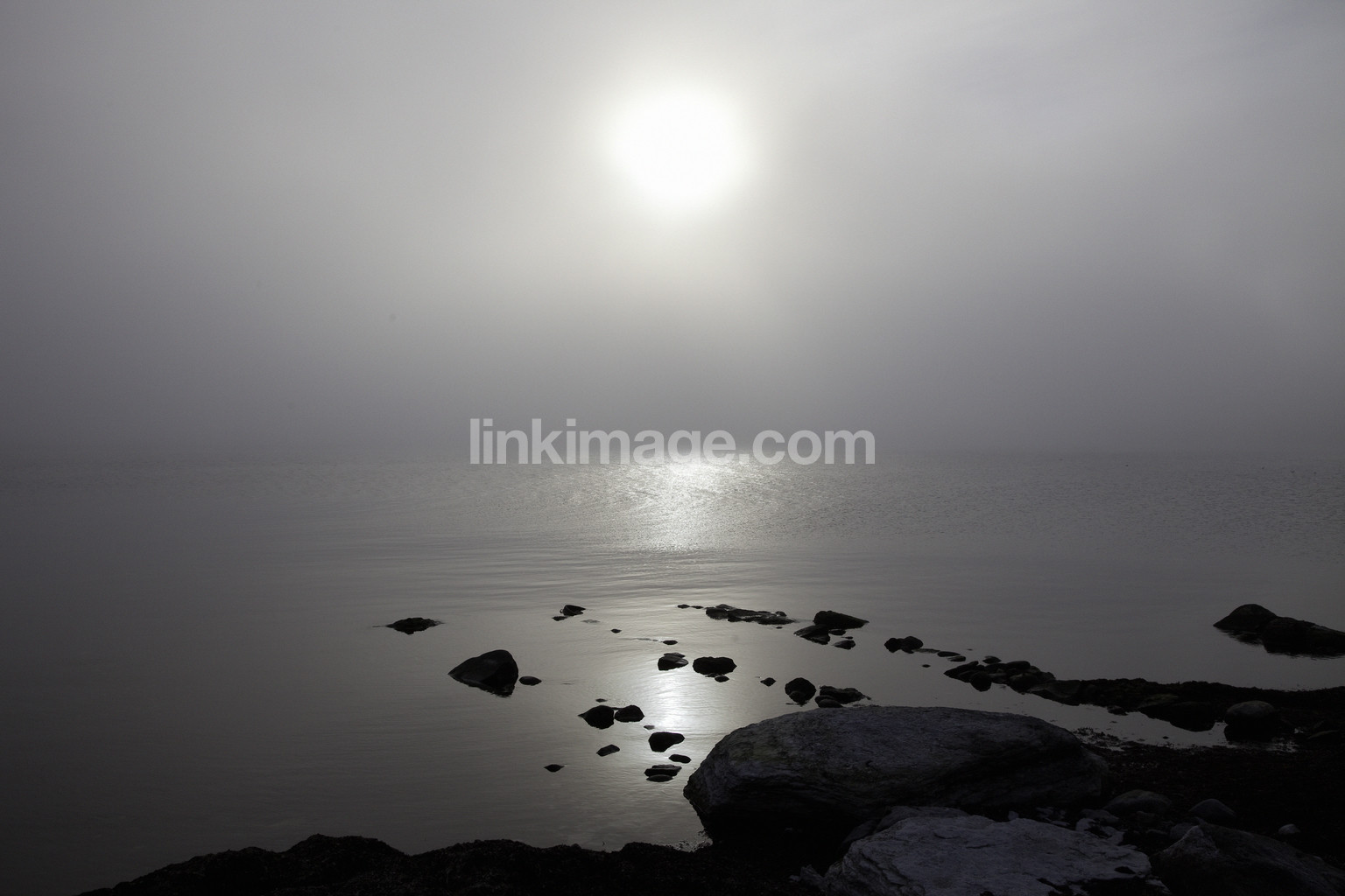 - spot, sea, water, fog, weather, sun, reflection, shore, stones, light, horizon, mystery, still, silent, nature, colors, gray, gotland, fårö