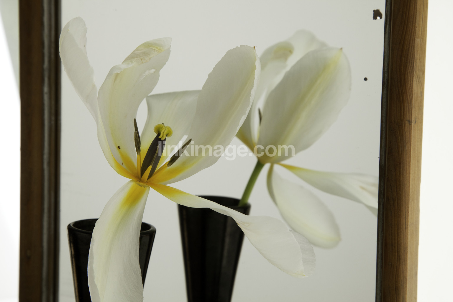 - tulips, flower, cut flower, stamens, two, mirror, reflection, white, yellow, form, vase, frame, garden, still life, fragrance, beauty, colors