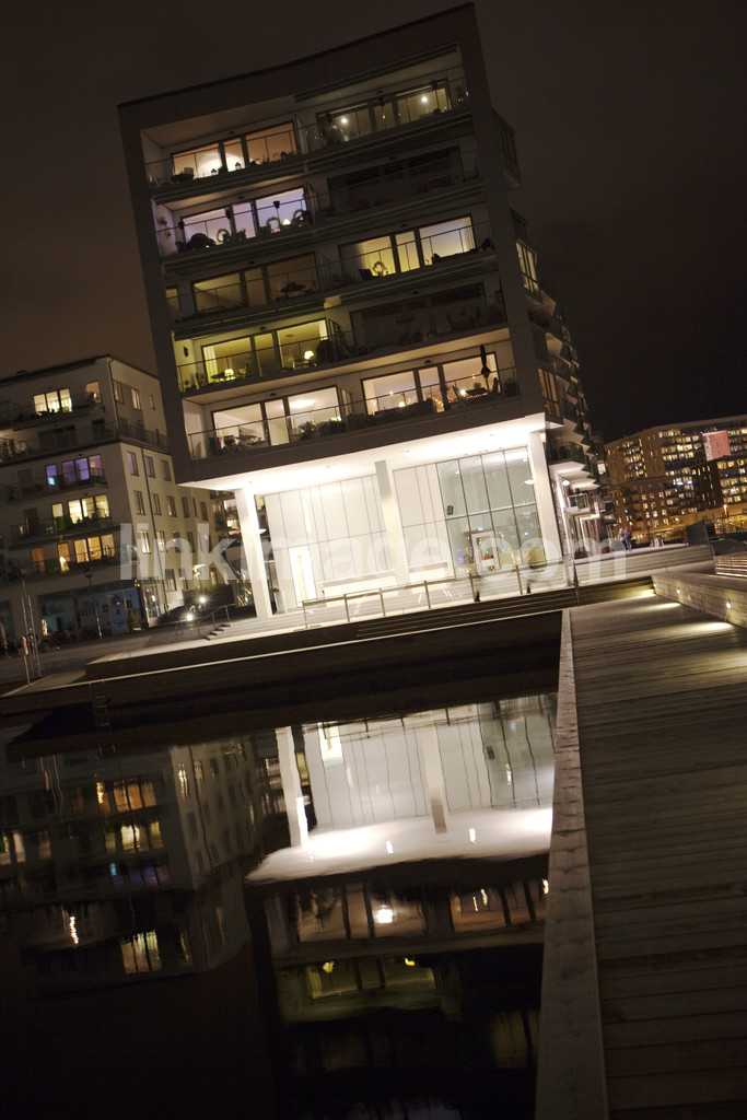 stockholm, night, building, evening, window, city, water, light, lighting, façade, apartment, houses