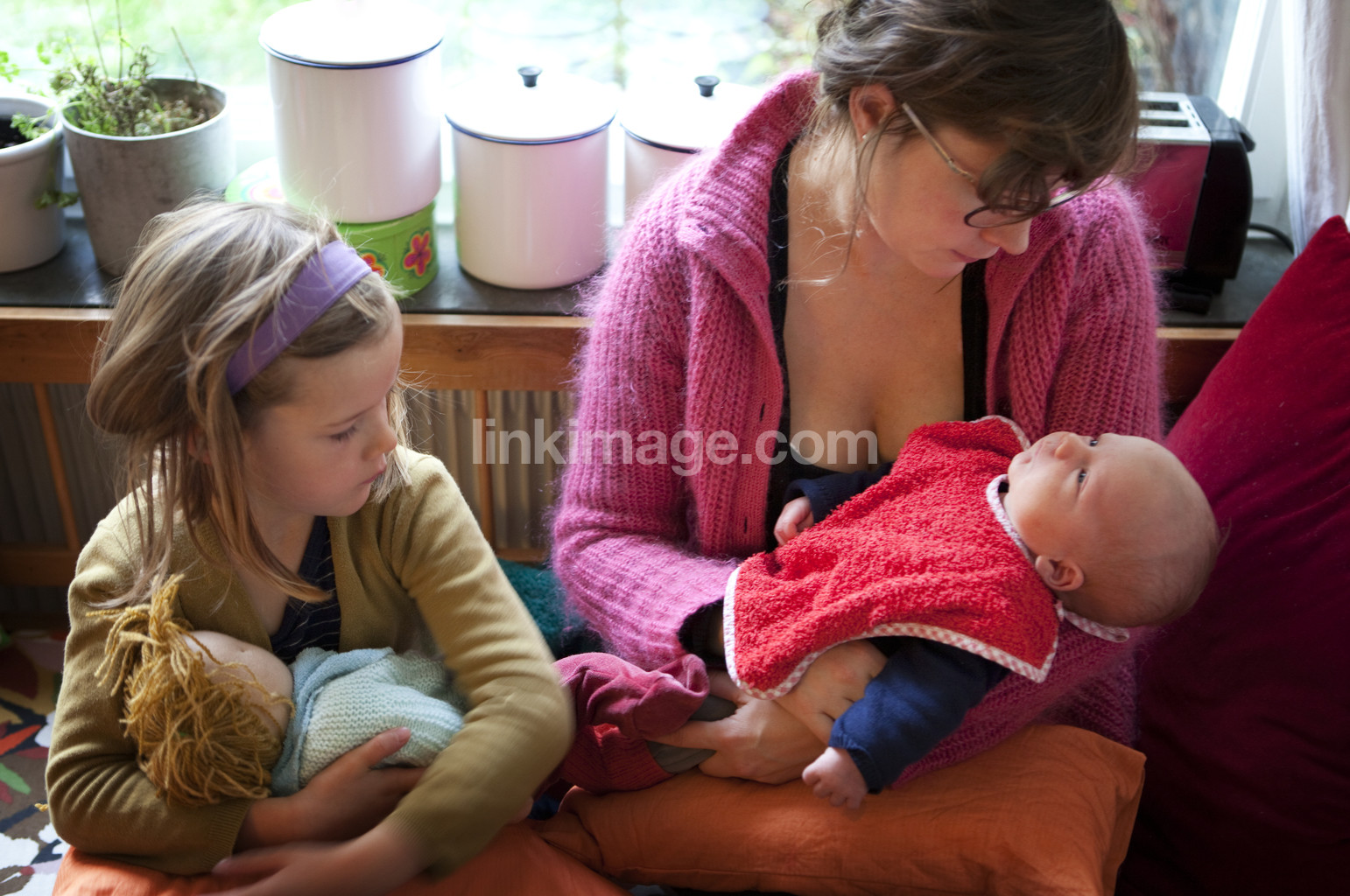family, mother, children, small, girl, siblings, female, hold, together, dock, gaze, watch, looking, mimic, mimics