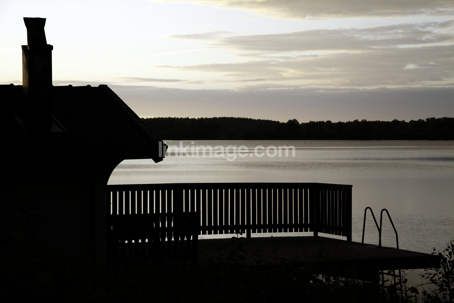 - lake, bath, swim, spot, light, bridge, bathhouse, fence, graphic, horizon, forest edge, dusk, evening, mood, enjoying