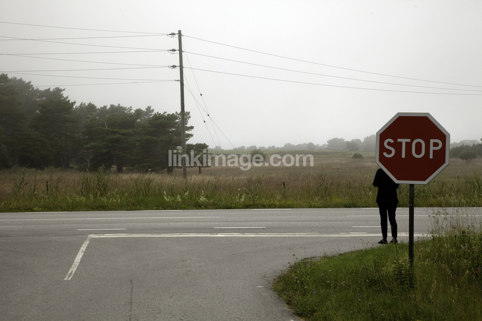 - stop, stop sign, sign, red, warning, call, figure, black, spot, human, wait, road, traffic, traffic sign, country, telephone pole, power pole