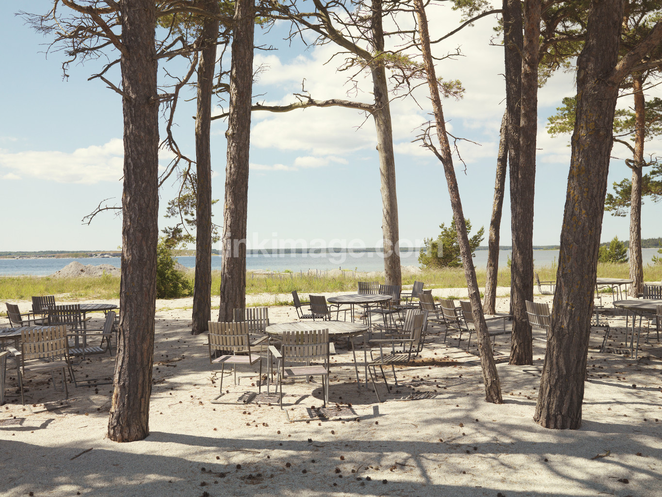 spot, tree, pine, table, chairs, water, sea, gotland, fate, summer, furillen, patio furniture, furniture, sand, shore
