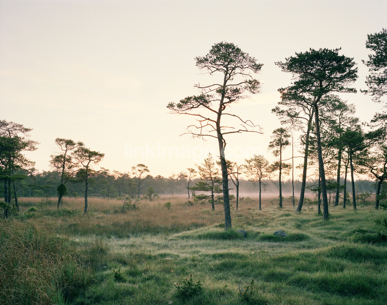 spot, meadow, pasture, pine, tree, forest, grass, nature, fog, haze, summer, morning, sunrise, dew, gotland