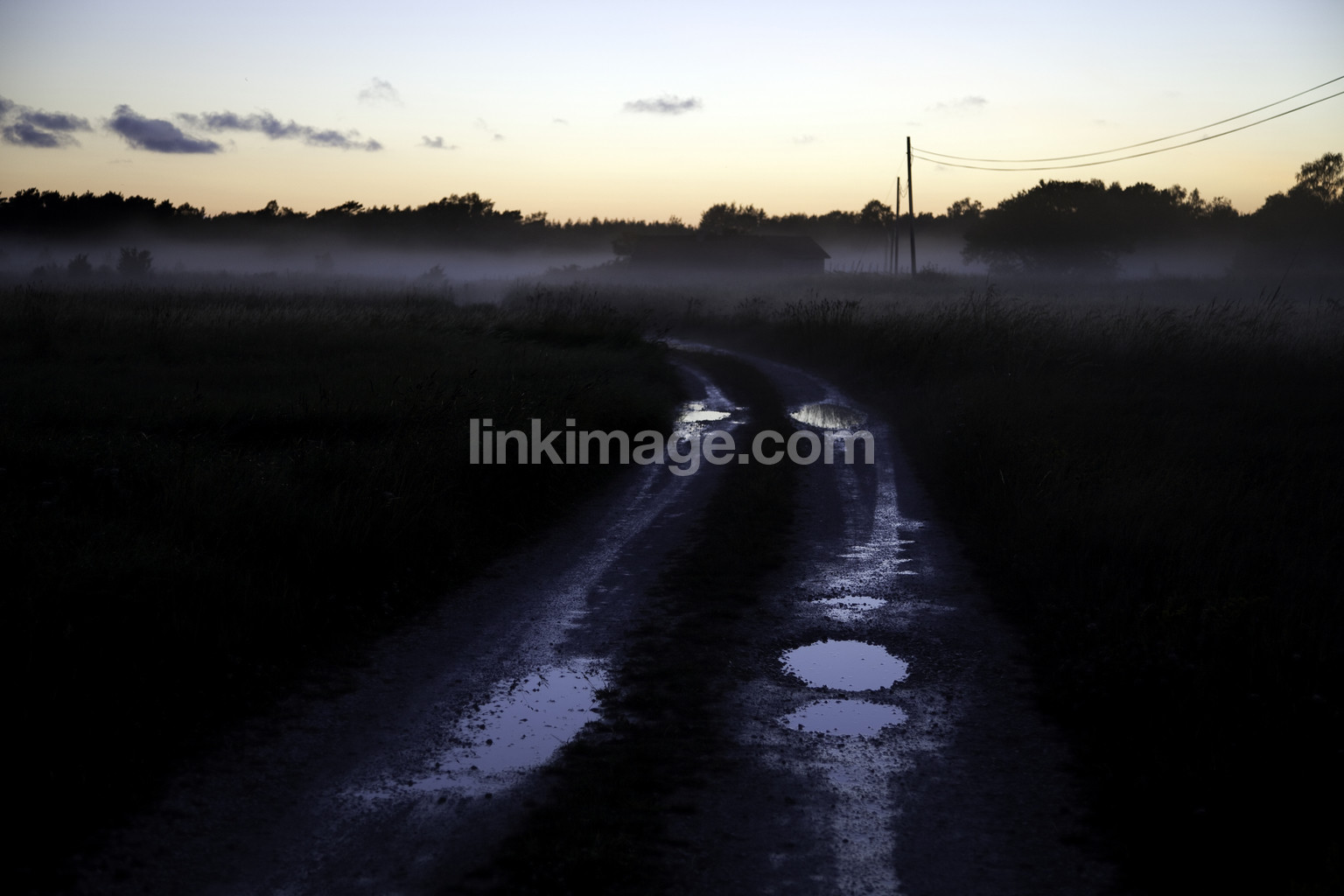 gotland, fårö, spot, dusk, evening, weather, light, road, gravel road, fog, water, puddles, moisture, rain