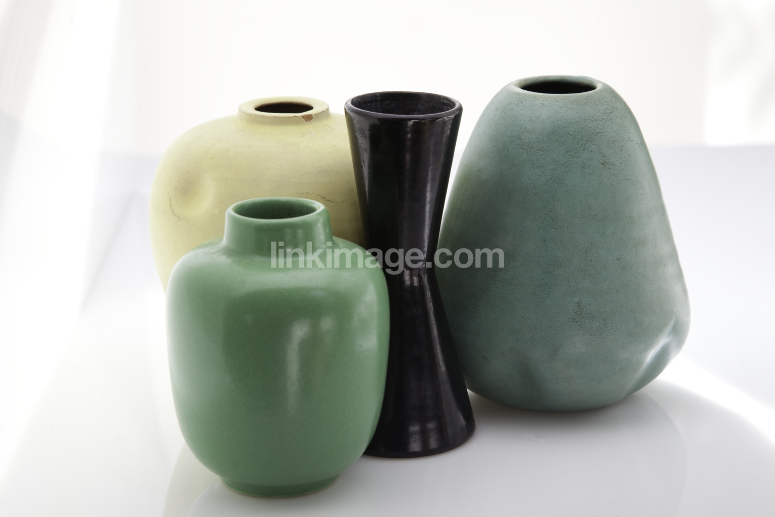 vase, vases, group, still life, form, design, four, greens, yellow, black, ceramics, crafts