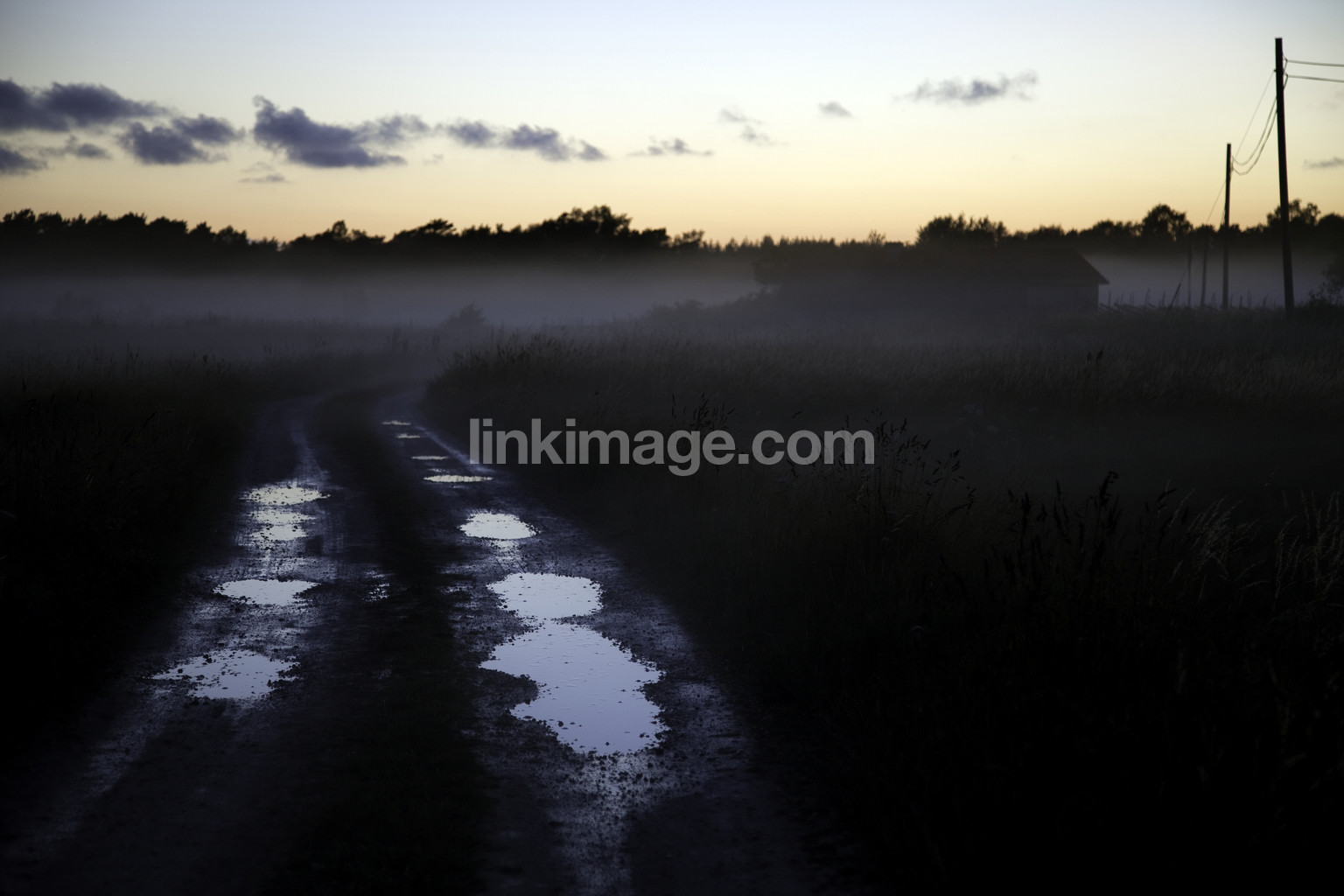 fårö, spot, gravel road, road, water, puddles, fog, weather, dusk, evening, rain