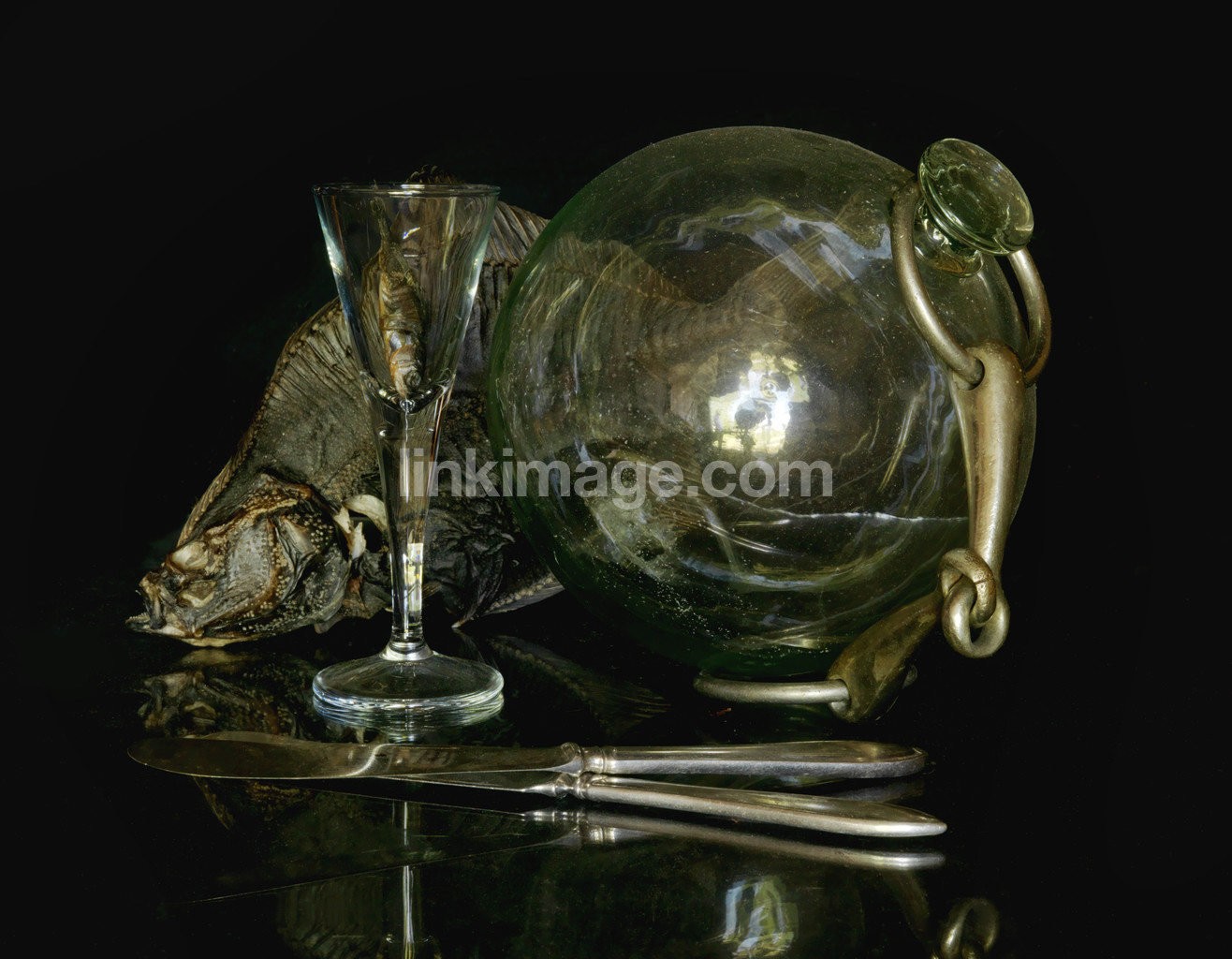 - still life, skeletons, form, abstract, fish, glass, shot glasses, glass sphere, knife, bridles