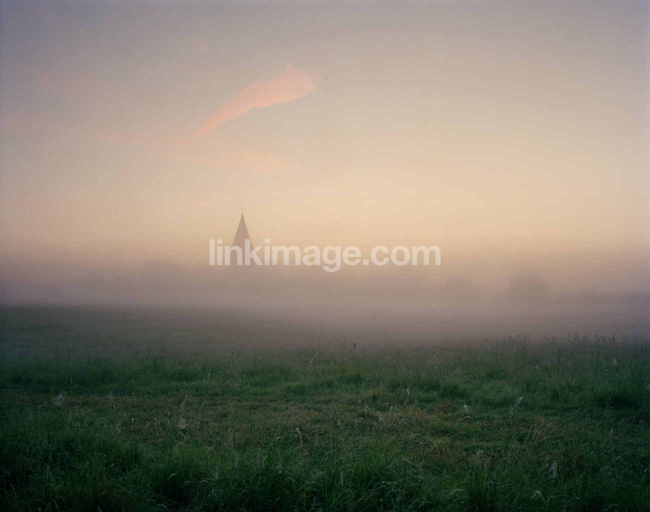 spot, fog, haze, morning, summer, sunrise, sky, grass, go, pasture, church, cloud, gotland