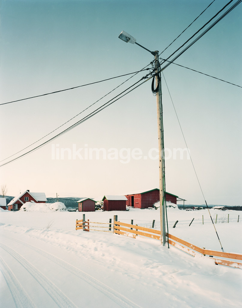 spot, snow, winter, lamppost, fence, house, barn, road, cold, telephone line, fate