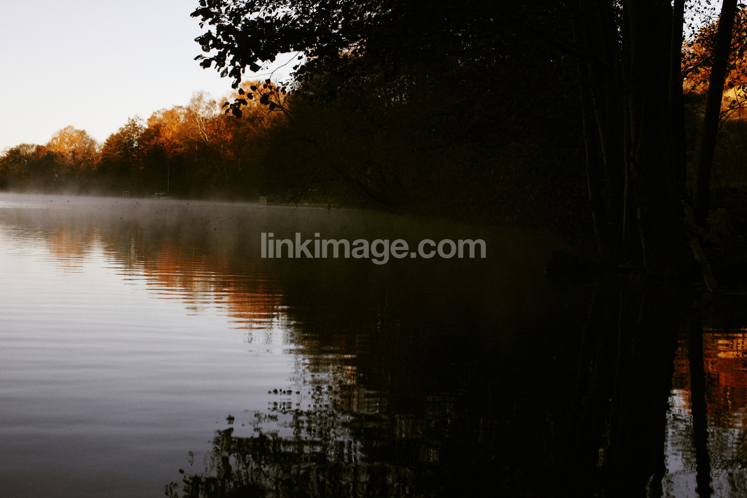 spot, reflection, tree, strains, branches, nature, water, fog, haze, sea, fall