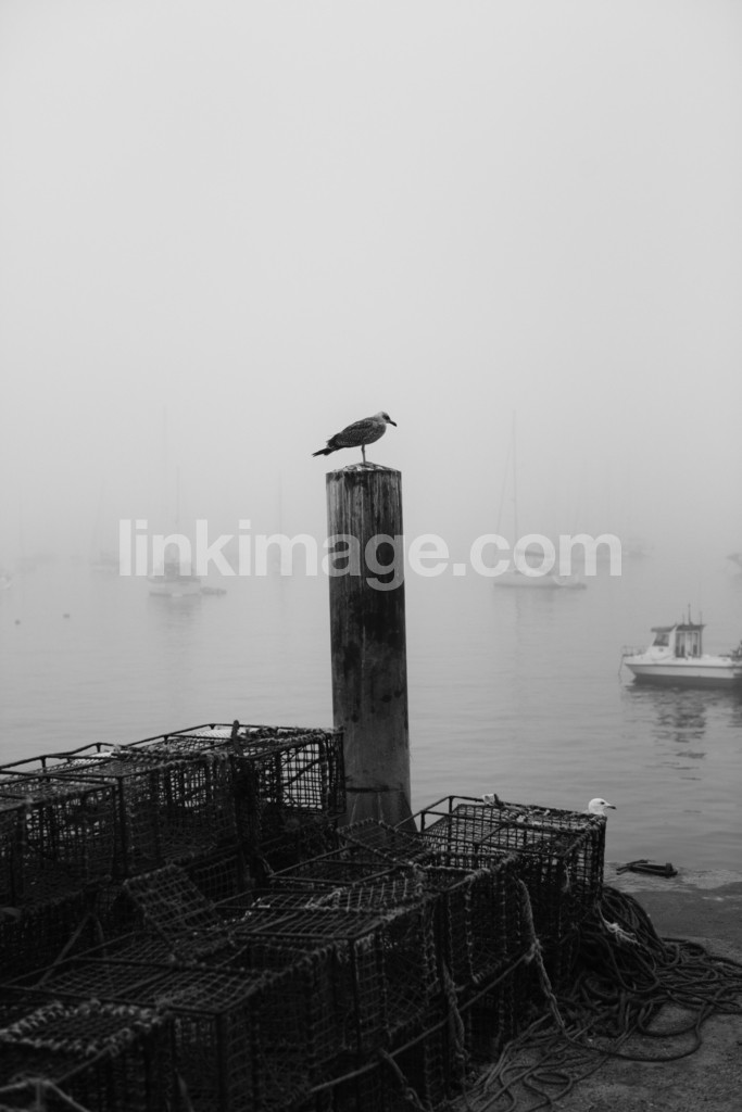 - fog, bird, seagull, birds, column, sea, boats, port, chain, fly, stock, mast, sailboat, berth, cage, cages, steel, grid, border