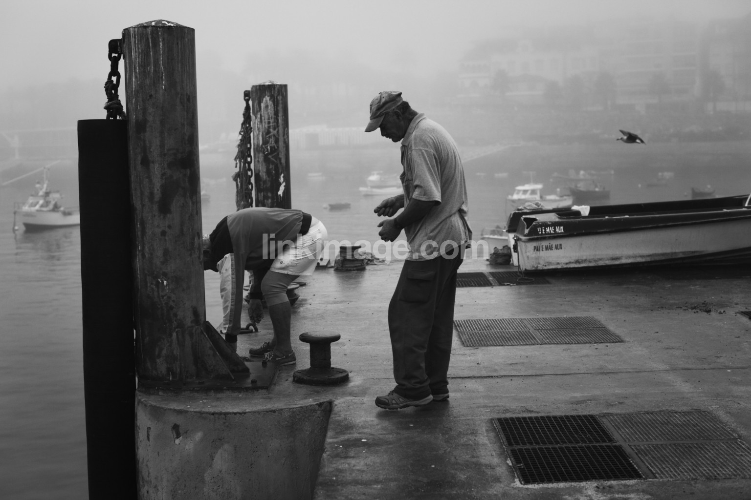 fog, male, old men, cap, bird, port, boat, fisherman, berth, city, shore, shoes, pants