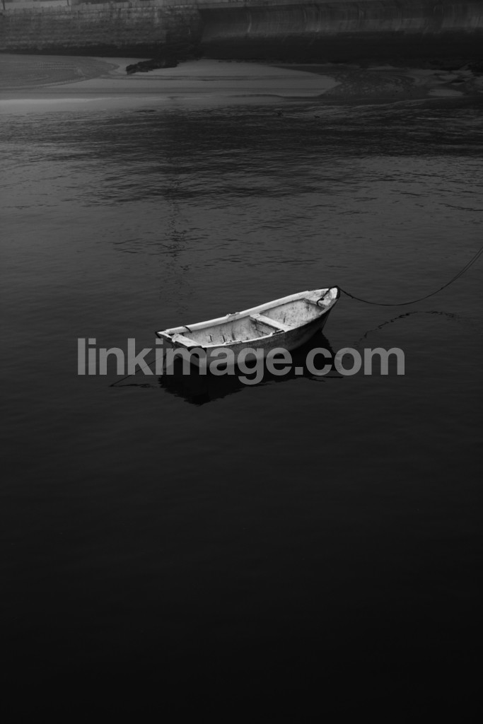 sea, water, boat, shore, wall, white, still, old, worn, moored, reflection