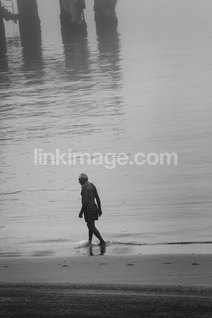 - male, shore, strawberry, shorts, fog, concrete, column, sea, stillness, reflection, exercise