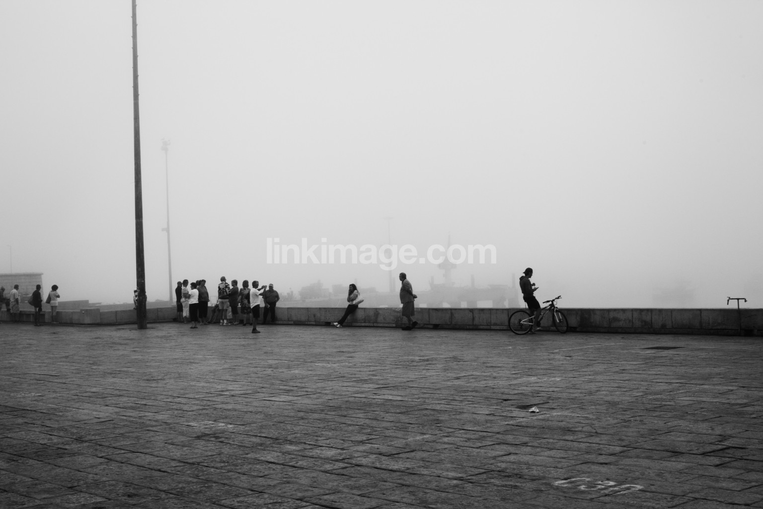 - fog, people, crowd, cycle, wall, square, cobblestone, port, mast, digits, number, mountain bike