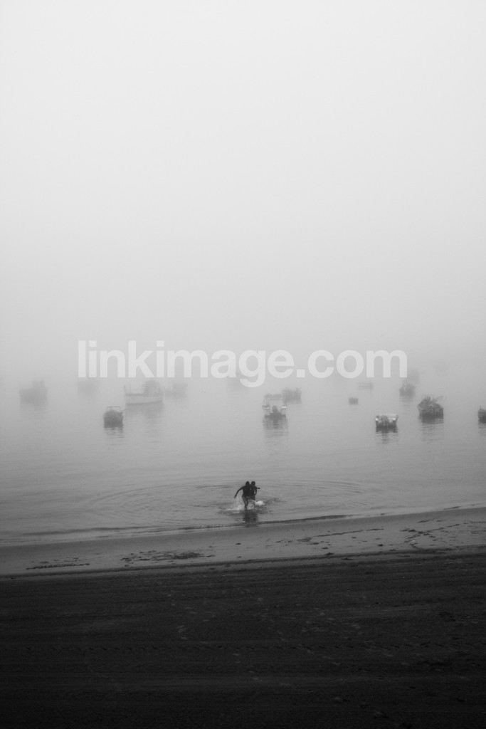 shore, adolescents, people, love, boats, fog, sea, water, quiet, stillness, bikini, shorts, play
