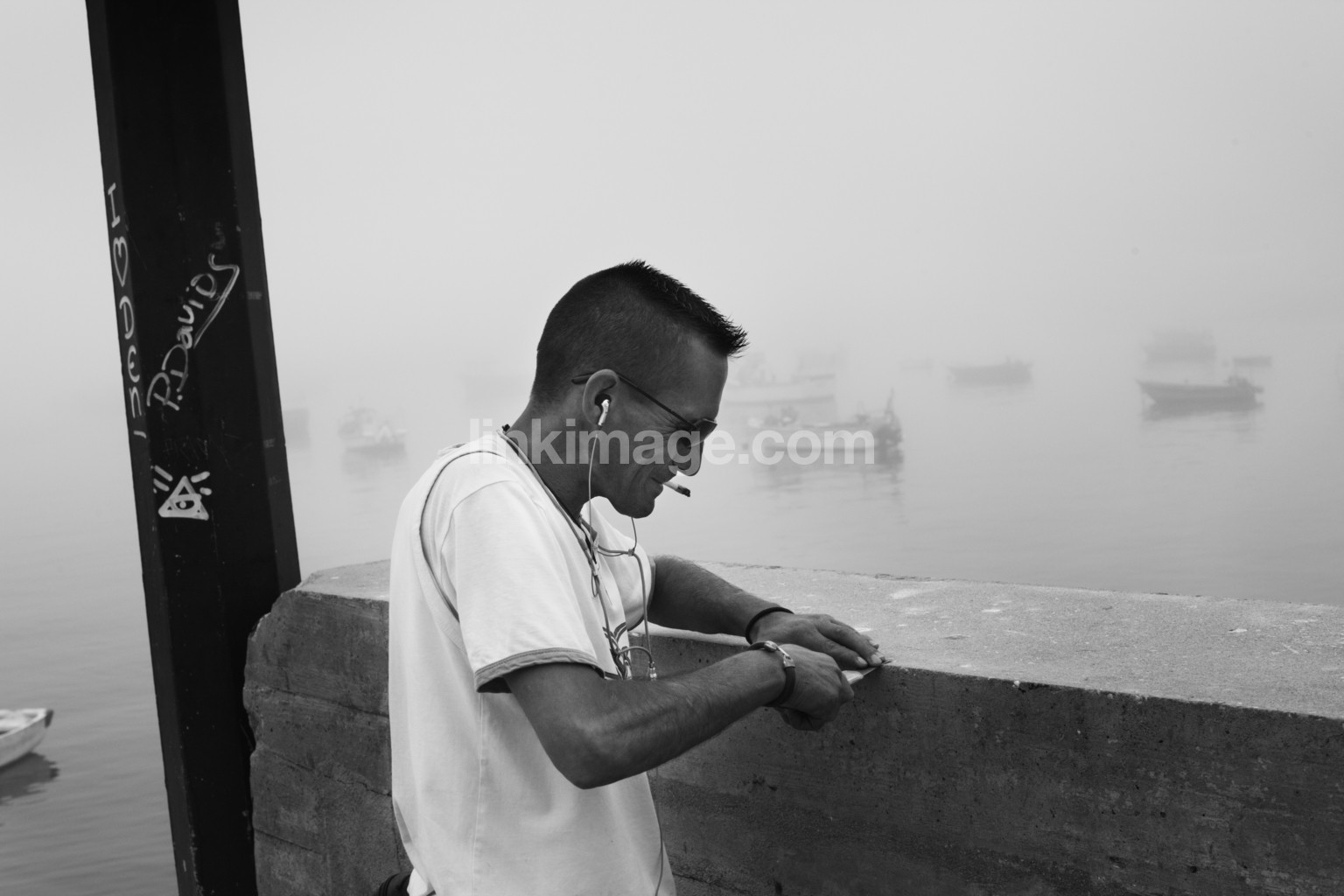 - male, concentration, port, boats, knife, fisherman, headphones, cig, cigarette, tshirt, steel beam, wall