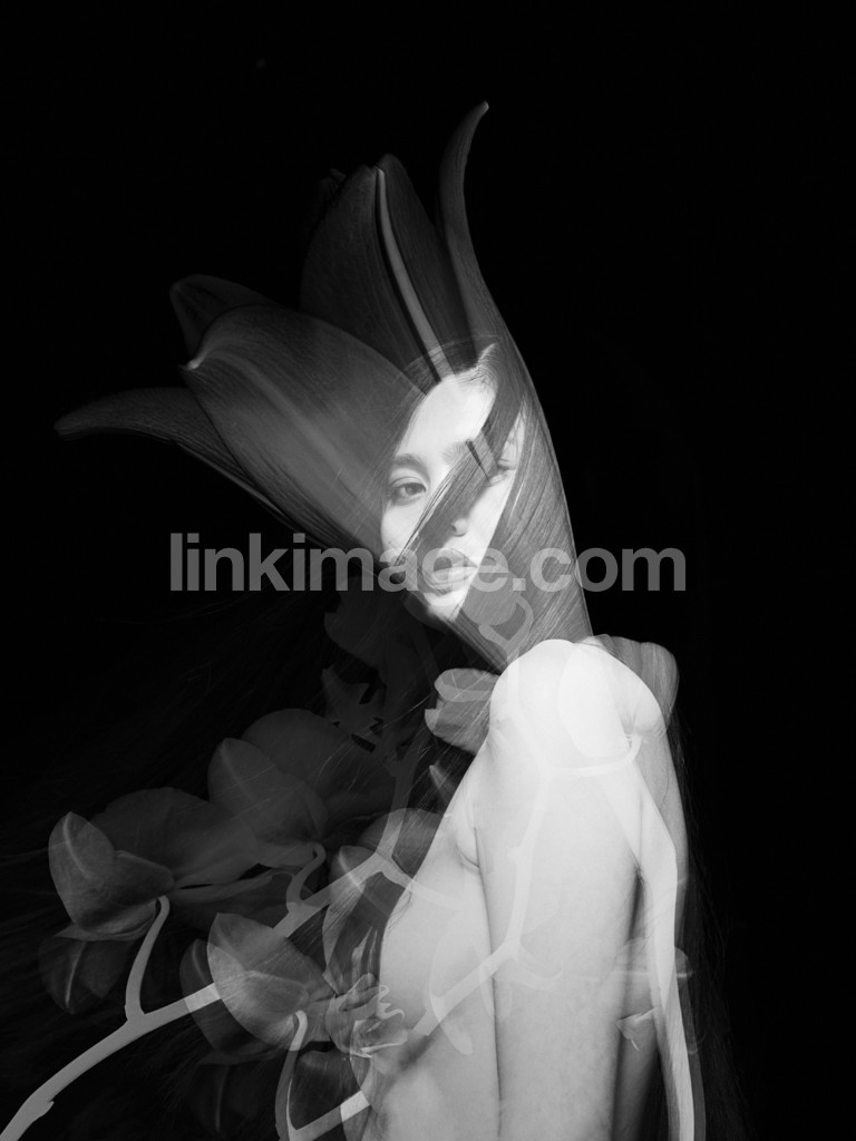 - female, flower, nude, orchid, collage, double, double exposure