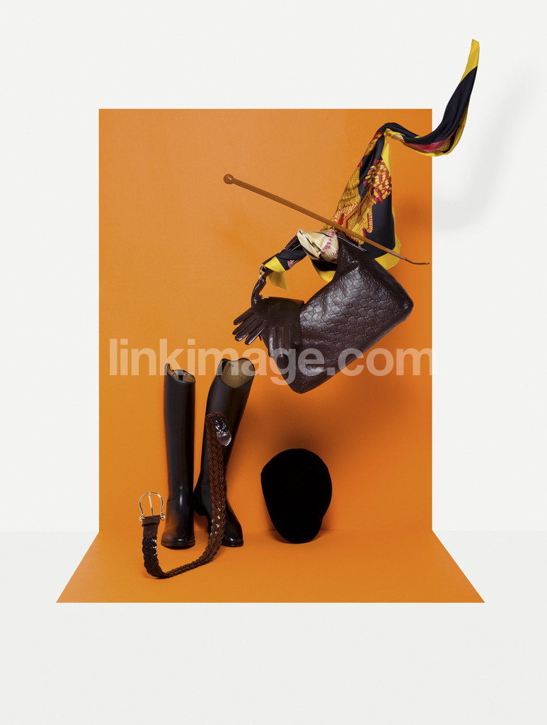 still life, clothes, fashion, skins, boots, bag, gloves, belt, scarf, orange, subject
