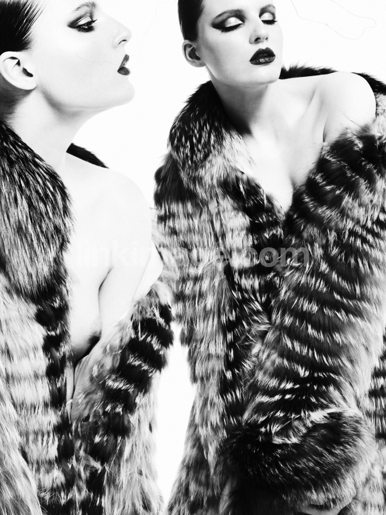 - female, fur, nude, makeup, close your eyes, black, white