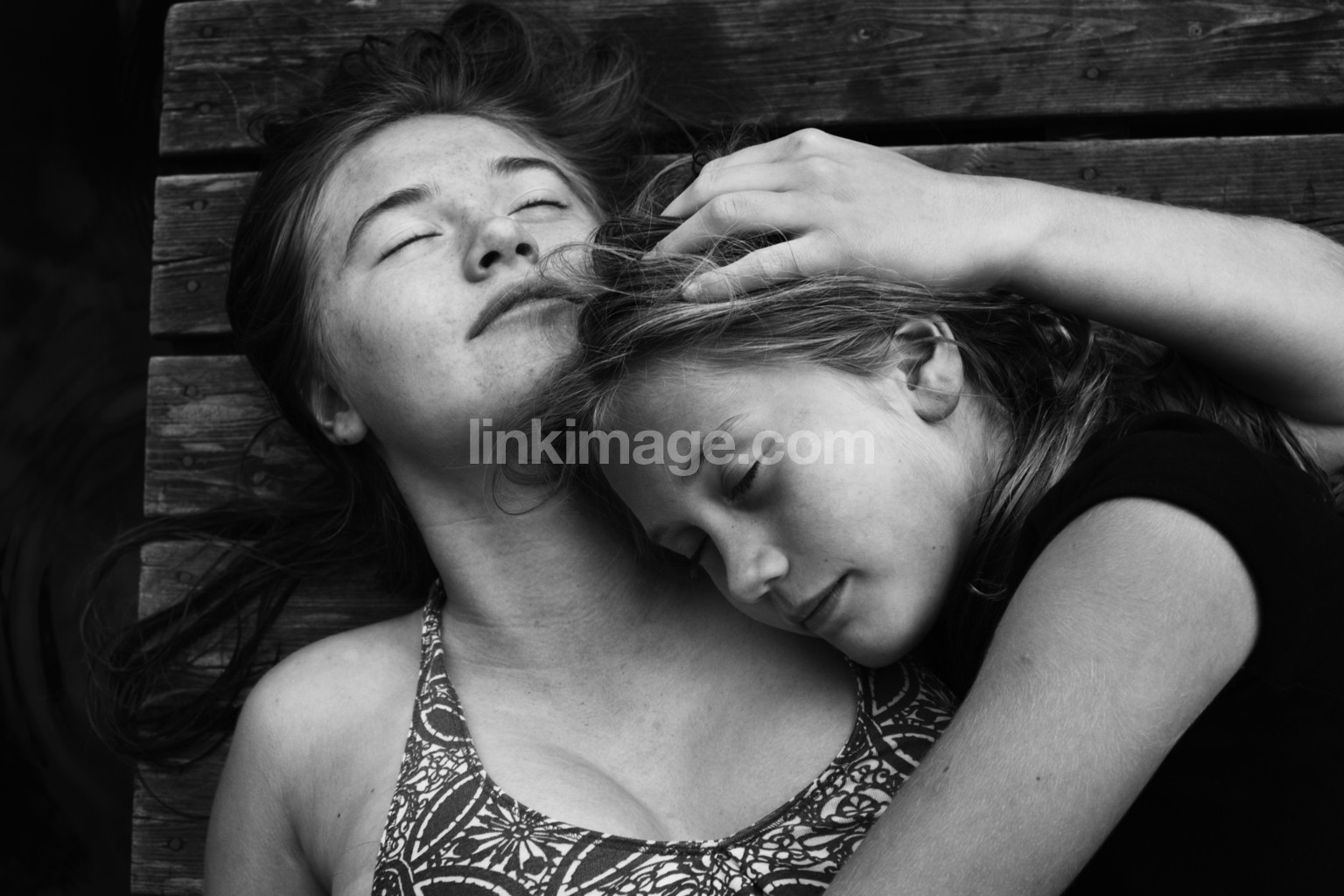 bridge, lake, water, skirt, dress, wood, planks, spikes, smile, mys, hug, girls, female, girl, love, siblings, hair, consideration