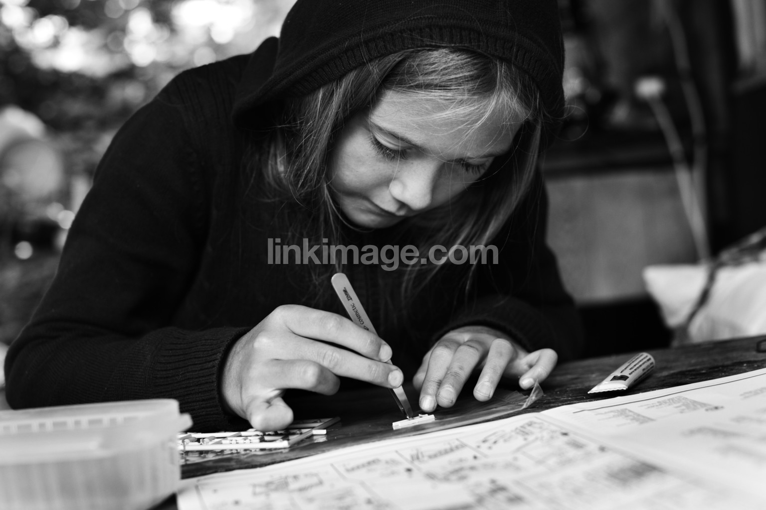 glue, girl, hood, sweater, hands, hair, map, knife, concentration, forest, country, pottering