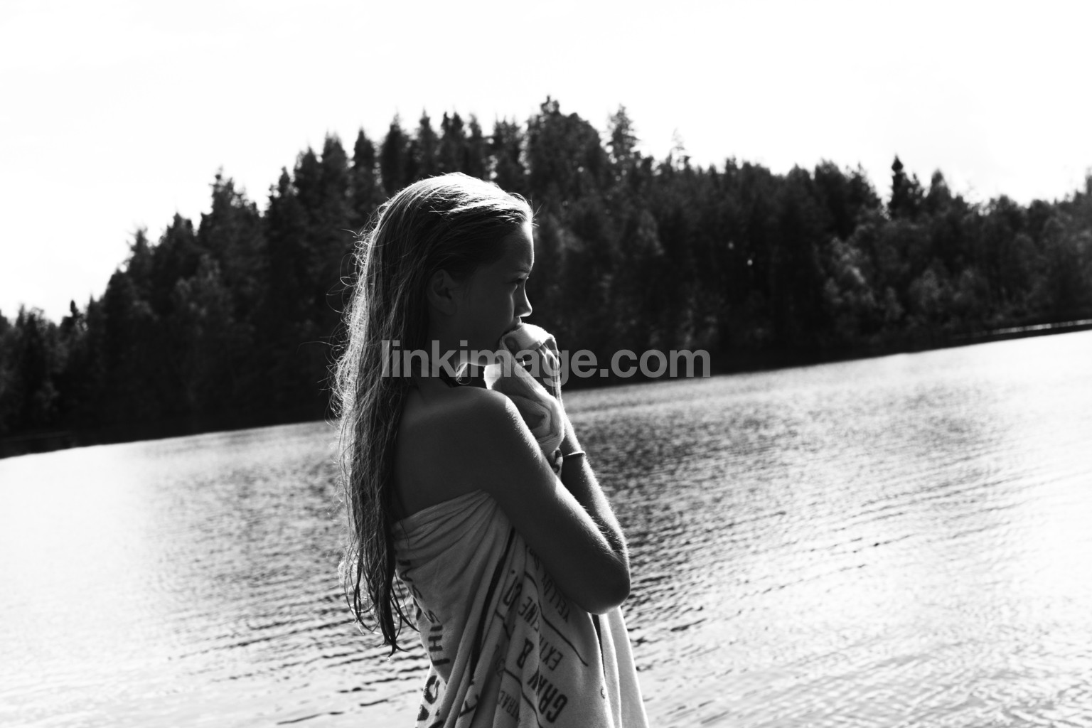 - lake, water, hair, girl, gaze, forest, towel, horizon, bracelets, silhouette, reflection, tree