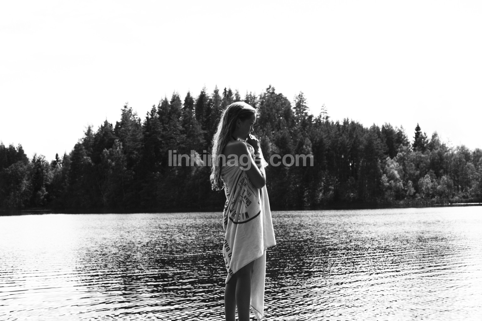 - lake, water, hair, girl, gaze, forest, towel, horizon, bracelets, silhouette, reflection, tree