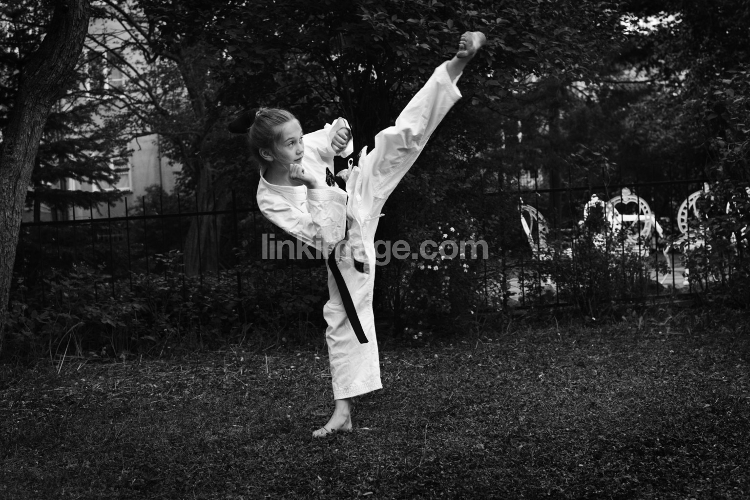 karate, king, fu, black, belt, kata, gi, tree, bush, girl, pose, grass, lawn, fence, garden, chairs, kick, window