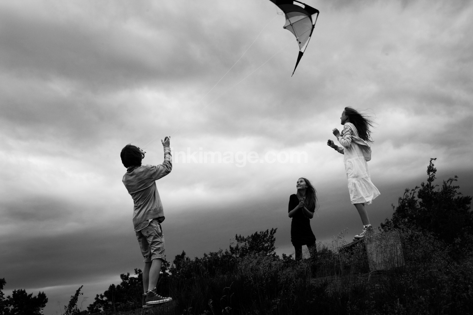 - children, girl, boy, fly, kite, cloud, drama, dramatic, meadow, country, bush, play, bus, dusk, dress, sky, wind, storm