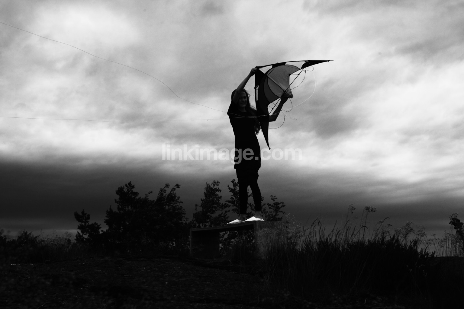 - children, girl, fly, kite, cloud, drama, dramatic, meadow, country, bush, play, bus, dusk, sky, wind, storm, cords